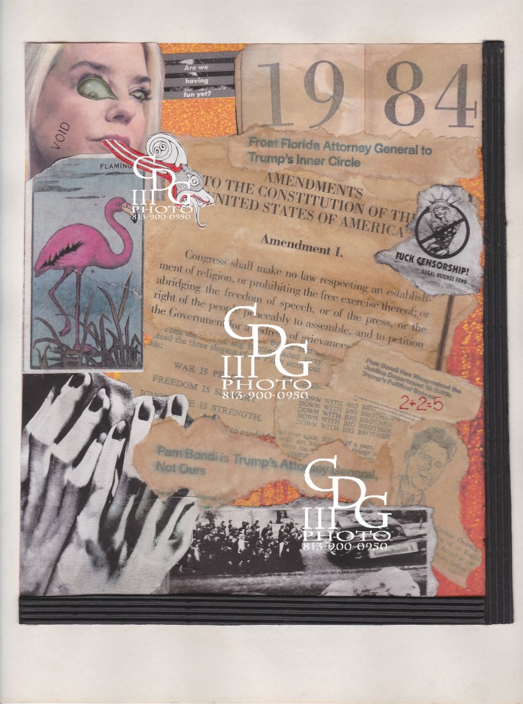 First Amendment Torn – 1984’s American Version is a collage featuring text and images related to political themes, including references to censorship, government, and societal issues. Various elements such as a flamingo and the US AG’s face, Pam Bondi, are combined with newspaper clippings and handwritten notes.